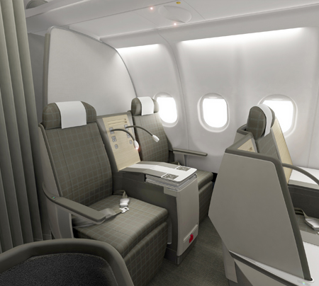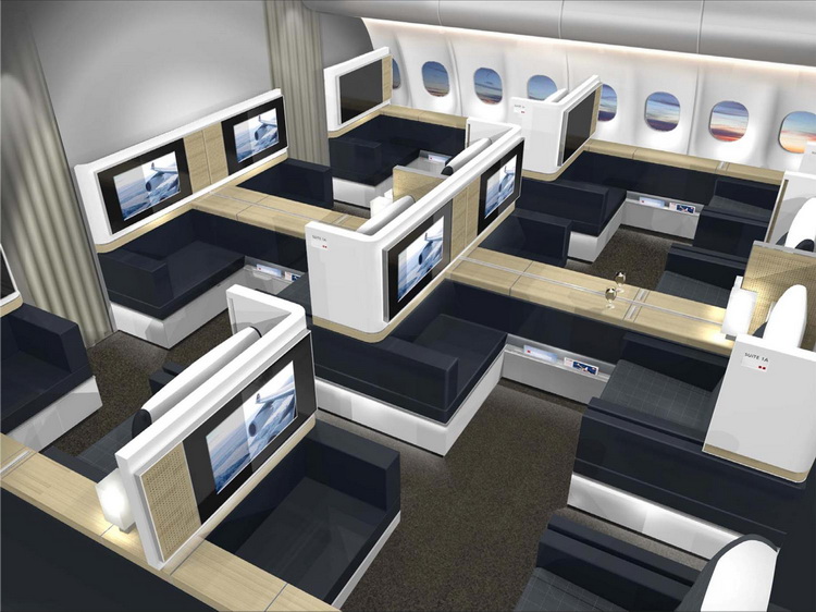 Sedišta, ili bolje reći, zasebne putničke kabine odlukuje veliki prostor za putnike. Raspored sedišta u kabini prve klase je 1+2+1, prostor sedišta je 211cm, širina sedišta (između naslona za ruke) je 56cm. Dužina stola je 66 ili 76cm a kada se sedište razvuče u krevet njegova dužina je 203cm i širina 60cm. Tokom leta putnicima se nudi a la cart posluženje i vrhunski izbor pića. Hranu spremaju profesionalni kuvari. Poslovni putnici imaju na raspolaganju priključke za svoj lap top računar i telefon a zabavni sadržaji su raznovrsni.