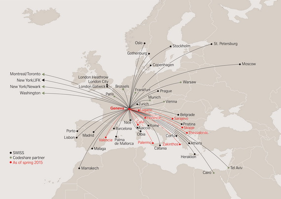 SWISS poslednje dve godine razvija svoju bazu u Ženevi. Sa novim linijama iz ovog grada će biti obavljan saobraćaj prema 39 destinacija u poređenju sa 12 koliko ih je bilo do pre dve godine. Novost iz Ženeve je i specijalna "Geneva Economy Light" tarifa koja uspešno konkuriše lowcost tarifama. Ova tarifa ne obuhvata predati prtljag i zgodna je za kratka vikend putovanja i za putnike bez prtljaga. Beograd je bio jedna od prvih destinacija na kojima je ova tarifa isprobana i gde se pokazala veoma uspešnom, pa će ona biti dostupna i na svim novim linijama iz Ženeve, a razmatra se i njeno uvođenje na pojedine linije iz Ciriha.