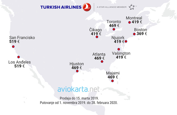Do 15. marta možete kupiti karte po znatno povoljnijim cenama do 10 gradova u SAD i Kanadi, kao i do još dvadeset gradova do kojih leti Turkish Airlines – u Aziji, Africi, kao i Južnoj Americi.