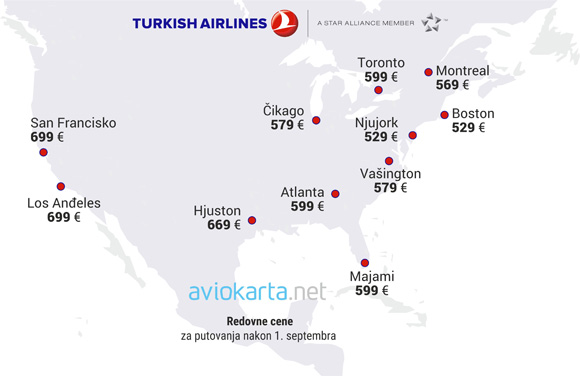 Ovom kompanijom možete leteti povoljno iz Beograda do Istabula dva puta dnevno i dalje preko njihove baze na aerodromu Ataturk direktnim letovima do ovih 11 gradova, kao i do skoro svih ostalih gradova u SAD u saradnji sa Unitedom, njihovim američkim partnerom.