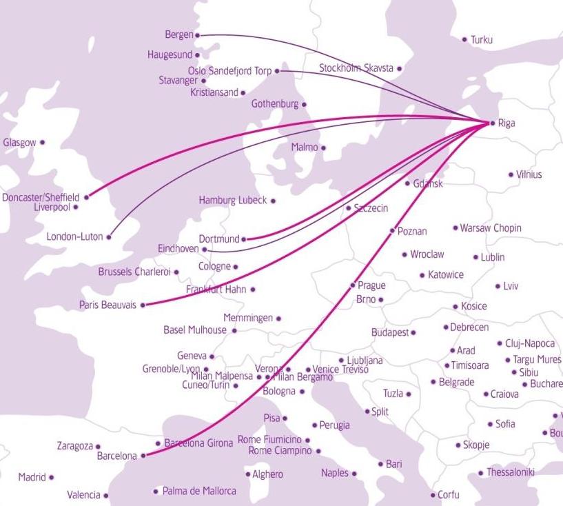 Wizz Air, koji za sebe kaže da je najveća lowcost aviokompanija u Centralnoj i Istočnoj Evropi trenutno ima sedamnaest operativnih baza u Beogradu, Bukureštu, Budimpešti, Klužu, Gdanjsku, Katovicama, Kijevu, Lavovu, Poznanju, Pragu, Skoplju, Sofiji, Targu Murešu, Temišvaru, Vilnjusu, Varšavi i Vroclavu koje se nalaze u devet država. Letonija će tako postati deseta država u kojoj Wizz Air ima svoju bazu.