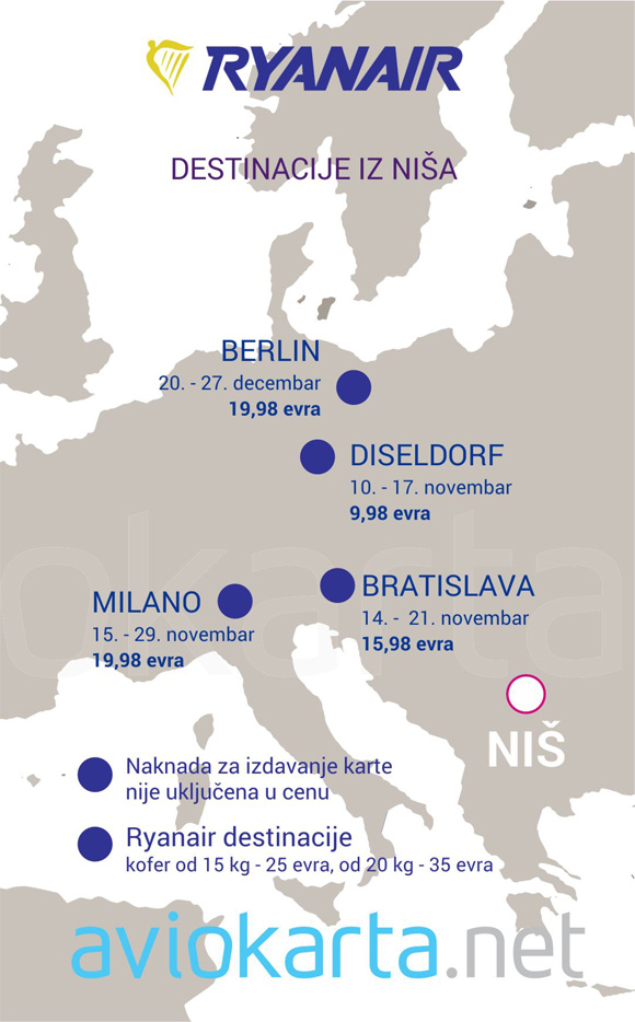 Od ove godine Niš je direktno spojen sa 9 evropskih gradova od kojih 5 povezuje Wizz Air, a 4 povezuje Ryanair. Cene se kreću uglavnom oko 50ak evra za povratnu kartu, sa uključenim samo malim kabinskim prtljagom u cenu, dok se kofer doplaćuje, iznose za doplatu smo naveli na mapi.