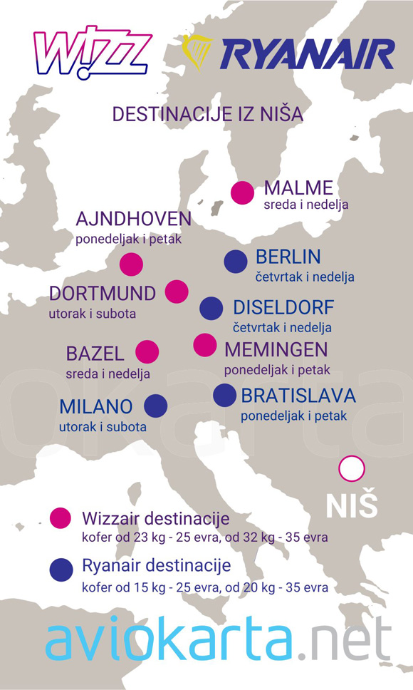 Od ove godine Niš je direktno spojen sa 9 evropskih gradova od kojih 5 povezuje Wizz Air, a 4 povezuje Ryanair. Nadamo se da je ovo samo početak i da će Niš postati baza za još kompanija, kao i da će ove dve kompanije otvoriti linije za još mnogo gradova. U svakom slučaju situacija je sada ovakva, i mi vam u ovoj mapi prikazujemo gradove do kojih možete putovati iz Niša. Naravno, ovo su gradovi oko kojih gravitiraju čitave regije, tako da letovima do ovih aerodroma stižete nadomak mnogih evropskih gradova.