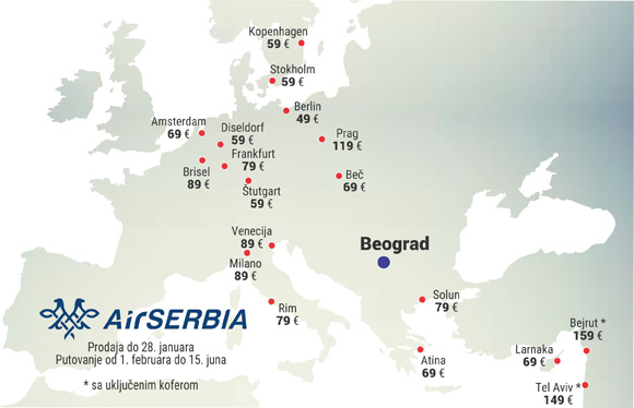 Ova ponuda važi za putovanja između Beograda i 18 gradova u Evropi i na Bliskom Istoku! Promotivne cene se primenju na karte u jednom pravcu, kao i na povratne karte, za putovanja u periodu od 1. februara do 15. juna 2019.